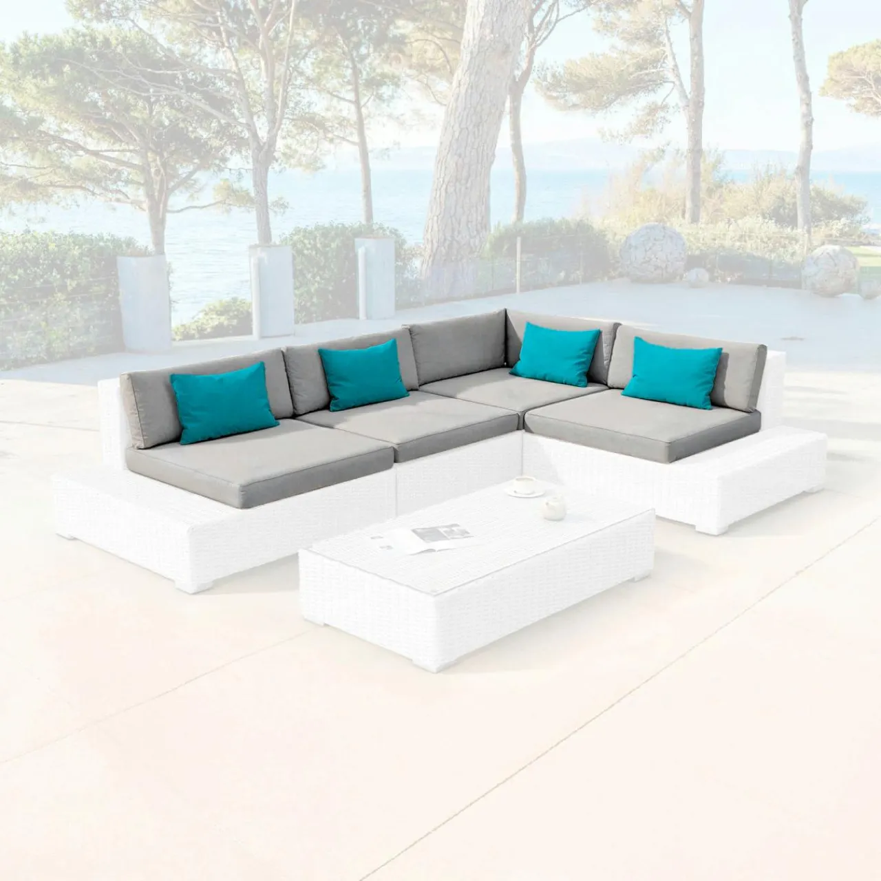 Ce lot comprend : quatre housses de coussin d’assise, cinq housses de coussin de dossier et quatre coussins déco en coloris bleu.