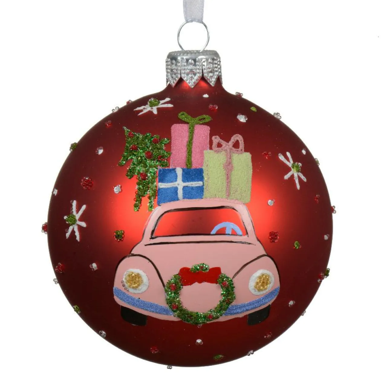 Nous succombons au charme de ces boules de Noël soufflées à la bouche, ornées de motifs joyeux d’une voiture et les cadeaux de Noël, ajoutant une touche d’élégance à votre décoration festive.