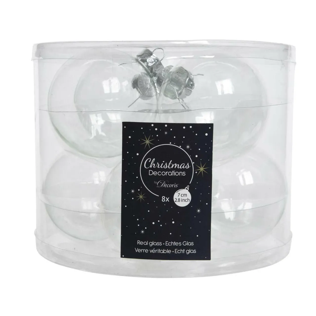 Des boules en verre transparentes pour une ambiance de Noël chic et hivernale.