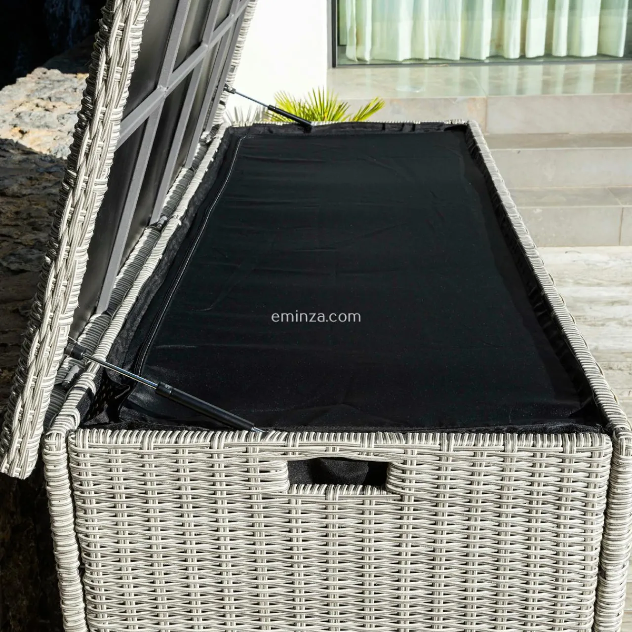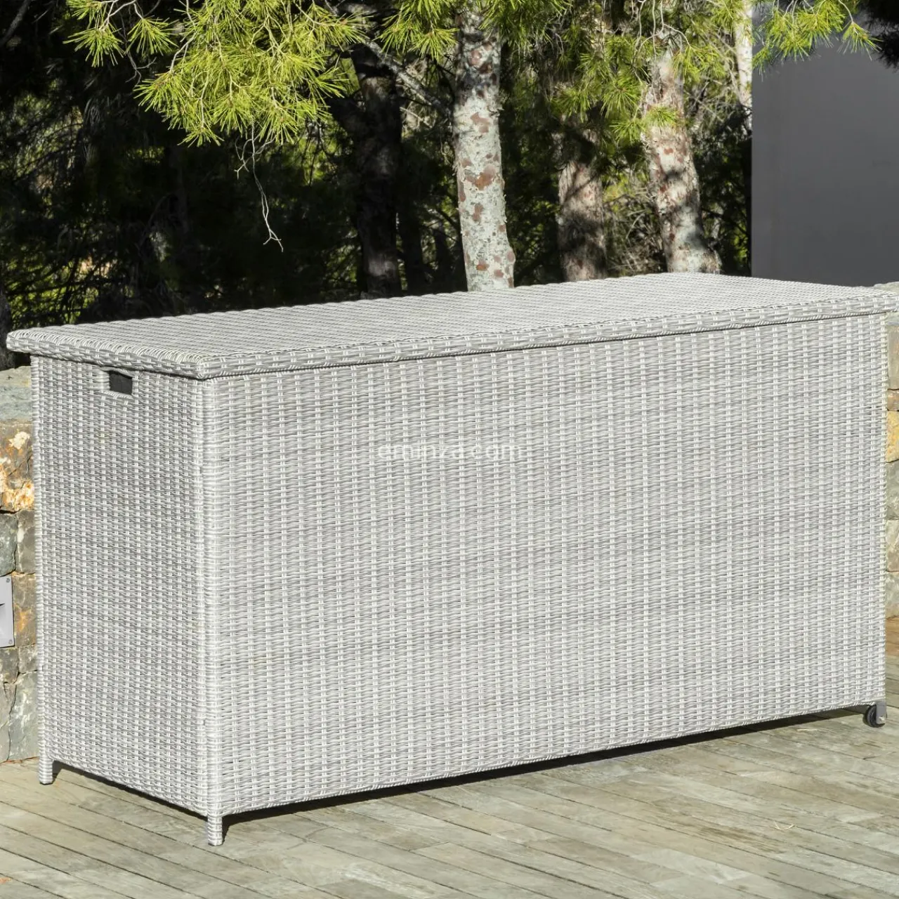Grâce à la grande capacité de ce coffre, vous allez pouvoir ranger tous les coussins de votre salon de jardin Calvi 7 places. De plus, son panneau en plastique et sa housse en polyester entièrement refermable, empêcheront l’eau de s’inflitrer. Pratique, il est muni de roulettes, d’une poignée sur le côté et s’ouvre sur le dessus.