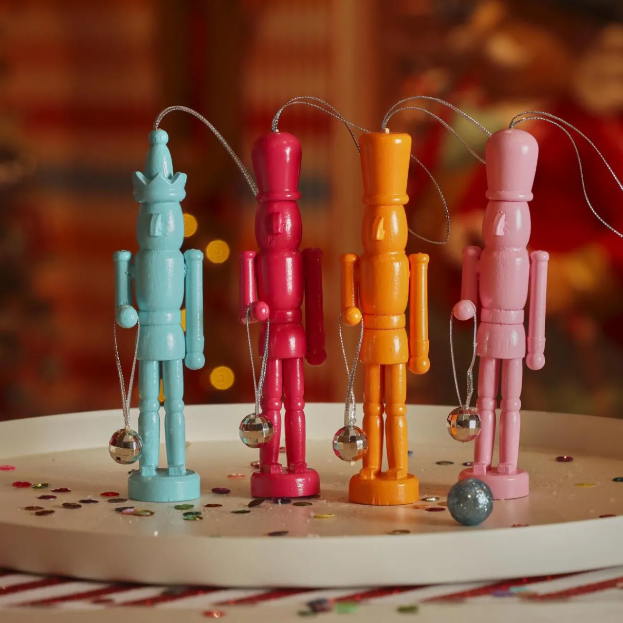Ces quatre suspensions en bois en forme de Casse-noisette apporteront une touche de couleur et de fantaisie à votre sapin de Noël. Bleu pétillant, rose fuchsia, rose clair et orange, ces décorations multicolores égayeront votre intérieur et plongeront votre maison dans l’ambiance festive des fêtes de fin d’année.