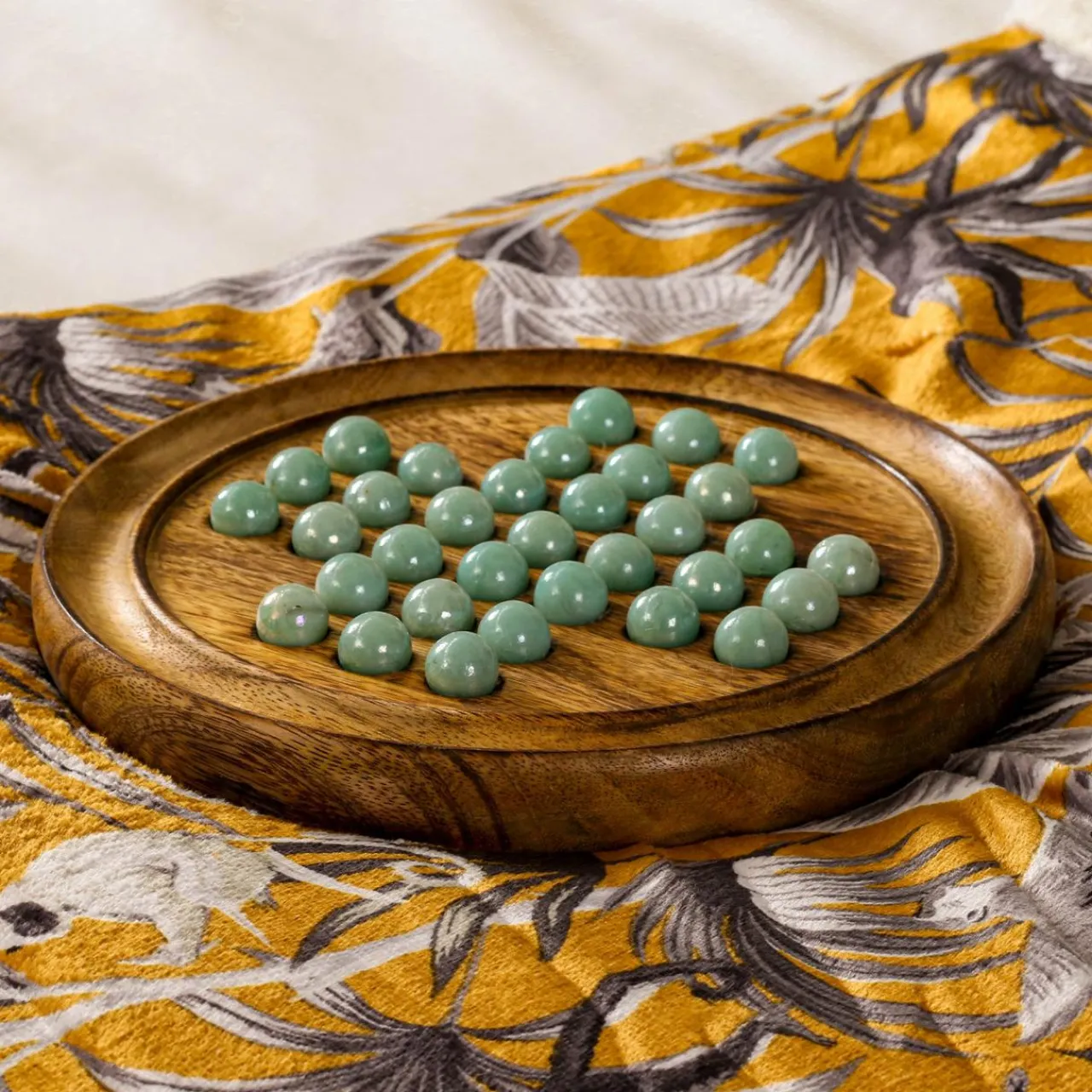 Matière : plateau en manguier et billes en verre.