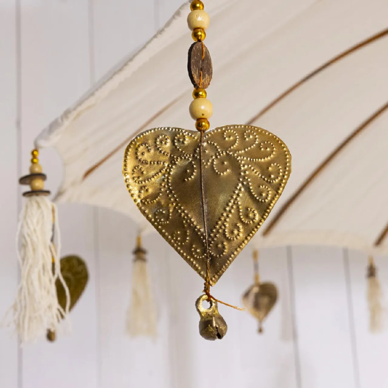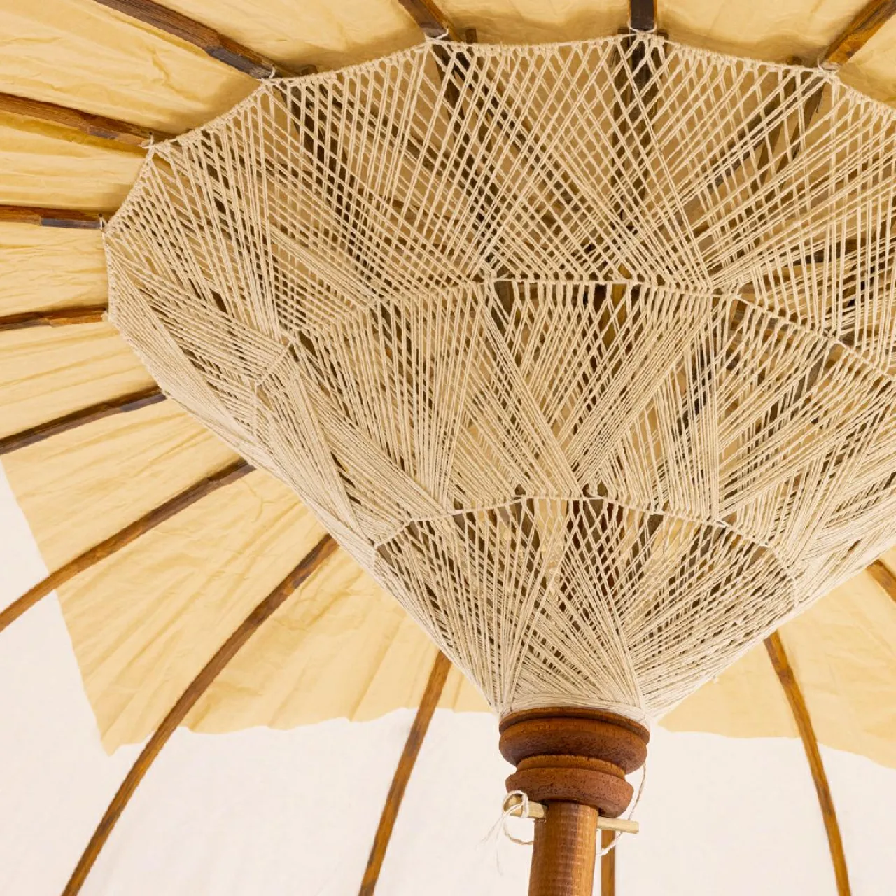 Une véritable invitation au voyage qui ne manquera pas de séduire. Le parasol possède de jolis éléments décoratifs en métal dorés qui bordent sa toile, ainsi qu’un mât en bois aux jolies finitions dorées.