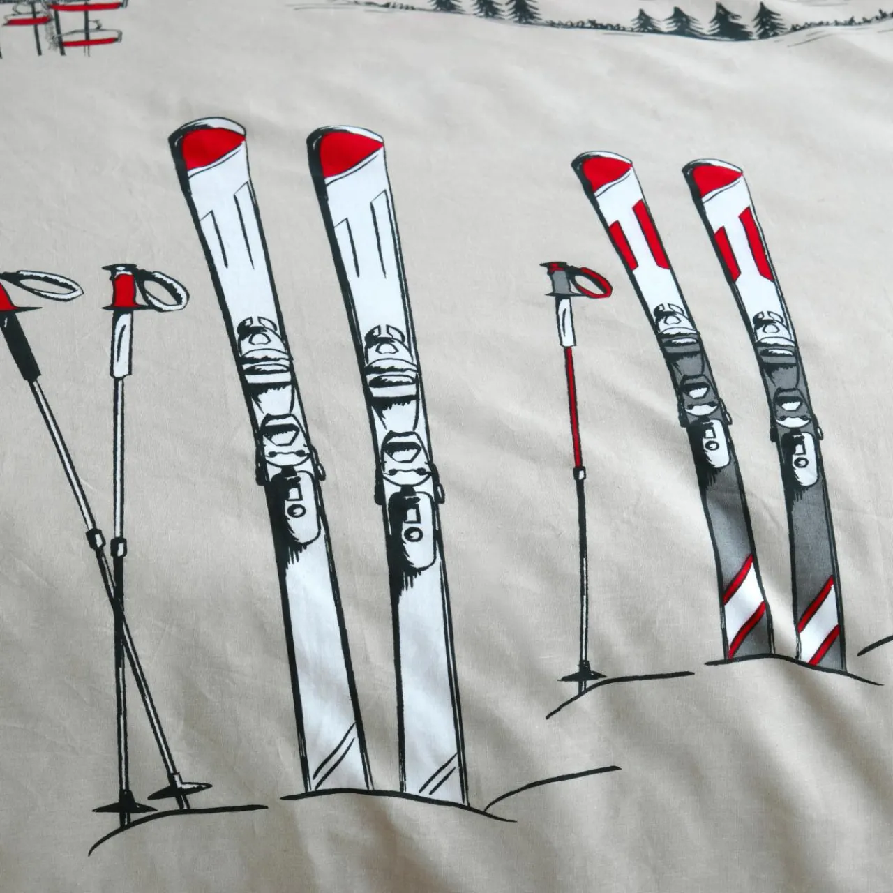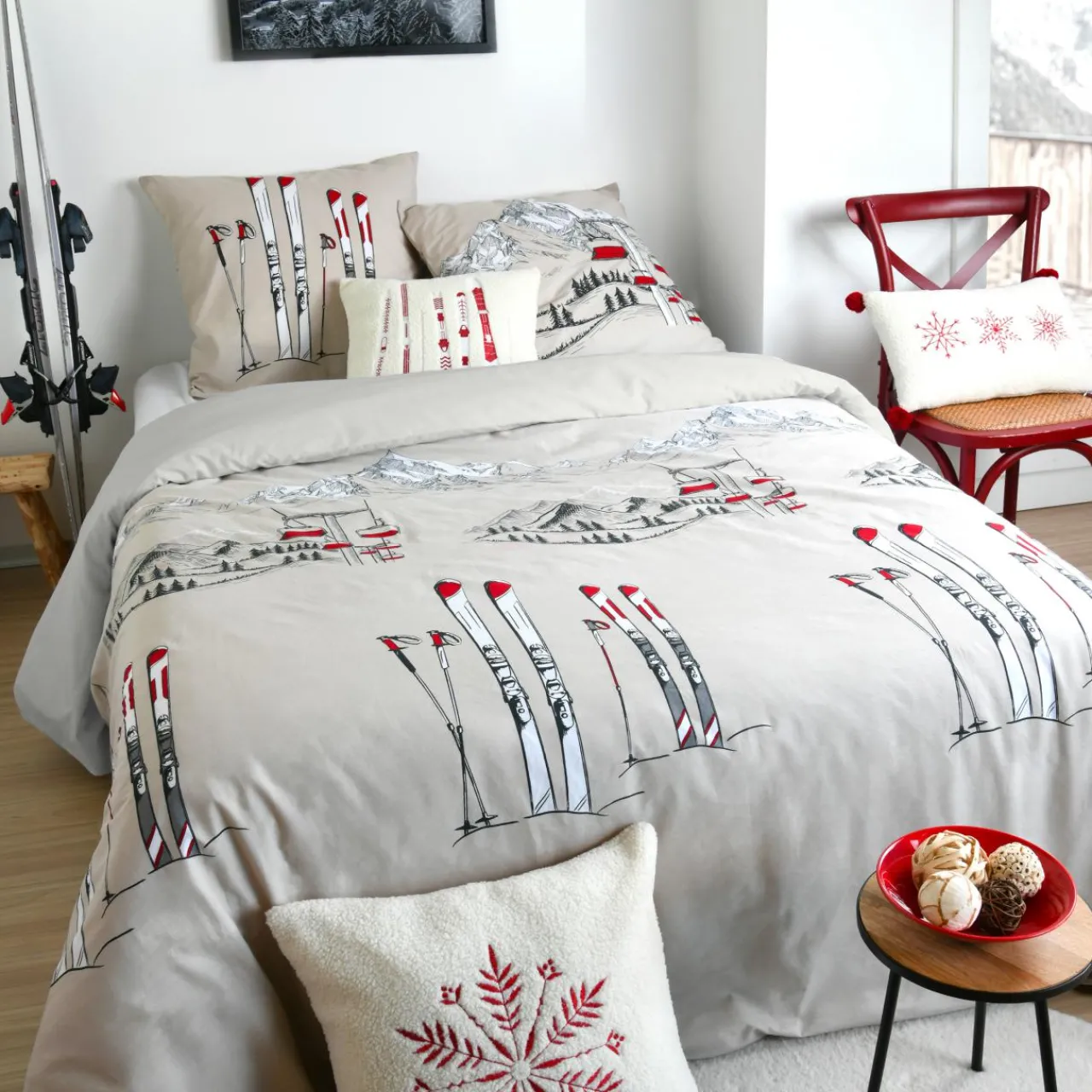 Imprimé : motifs skis rouge et gris.