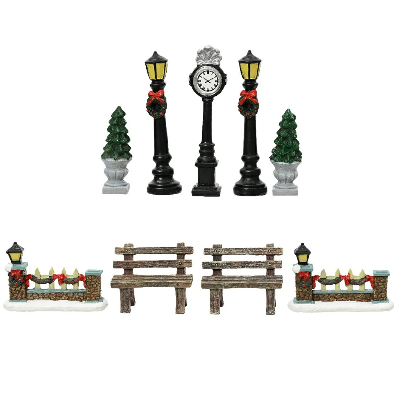 Lot comprenant 2 lampadaires, 1 horloge, 2 sapins, 2 barrières et 2 bancs.