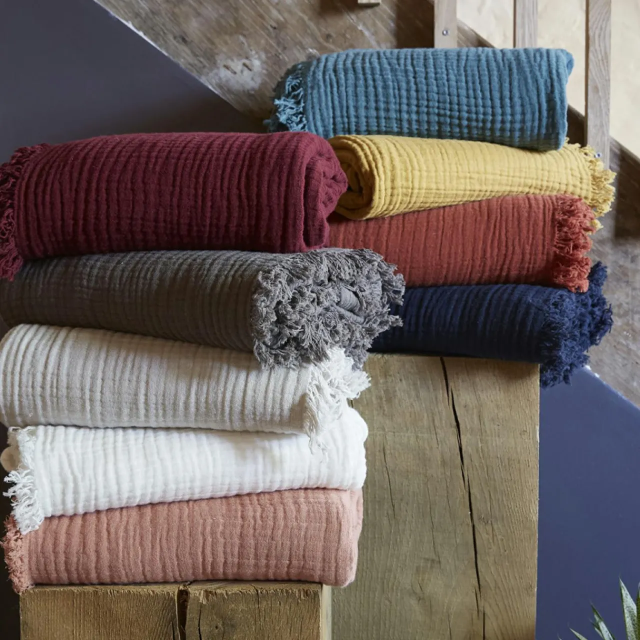Naturellement gaufré, ce plaid en gaze de coton ne nécessite pas de repassage.