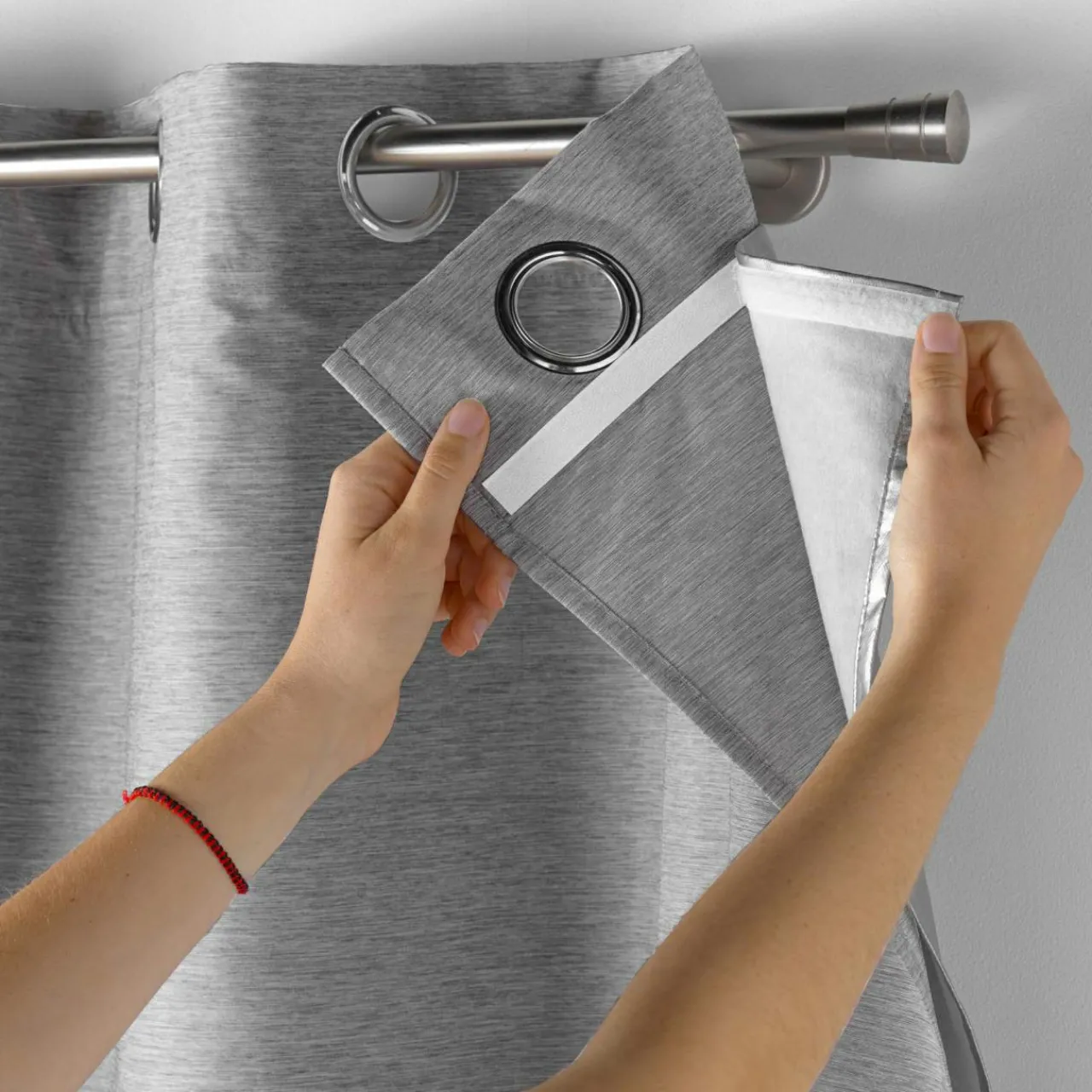 La doublure se fixe à l’aide d’un velcro sur le rideau.