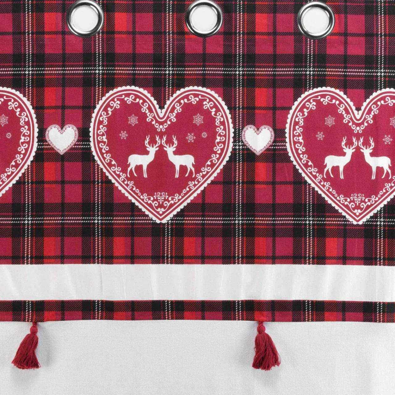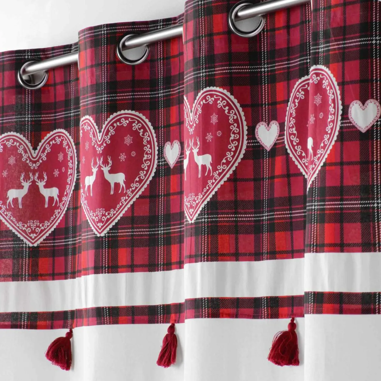 Imprimé : rideau à motifs carreaux et coeurs, et à pompons.