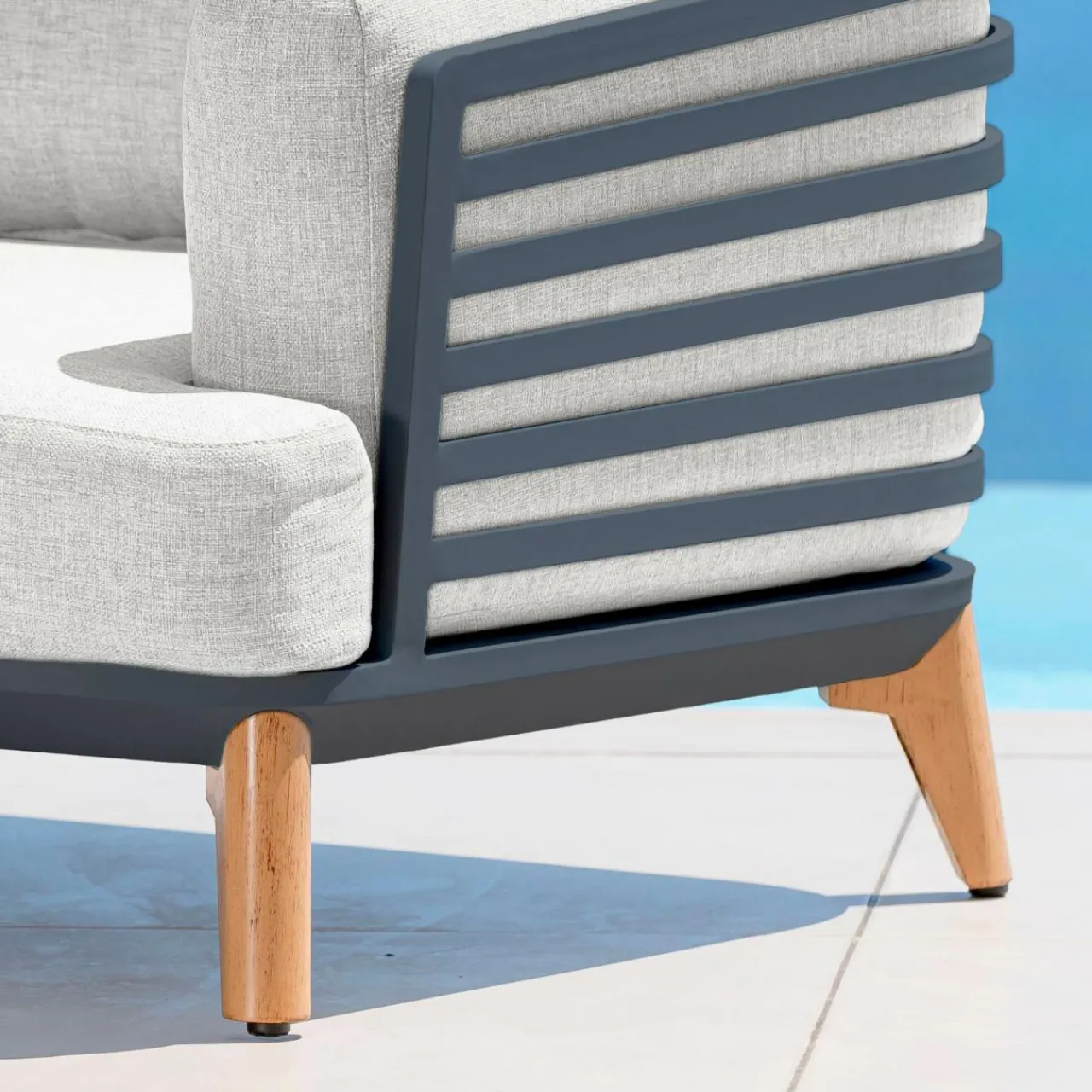 – Coussins déhoussables : polyester 240 g/m². Rembourrage éponge (28D + 25D) et coton plat. Le tissu est composé à 100% d’oléfine, résistant aux éclaboussures, déperlant et imperméable (classe III).