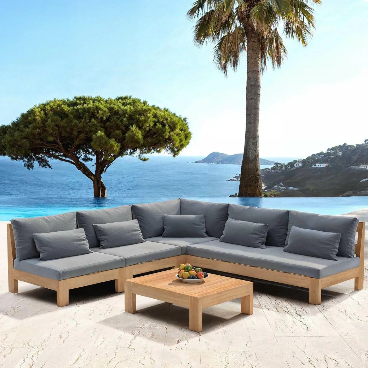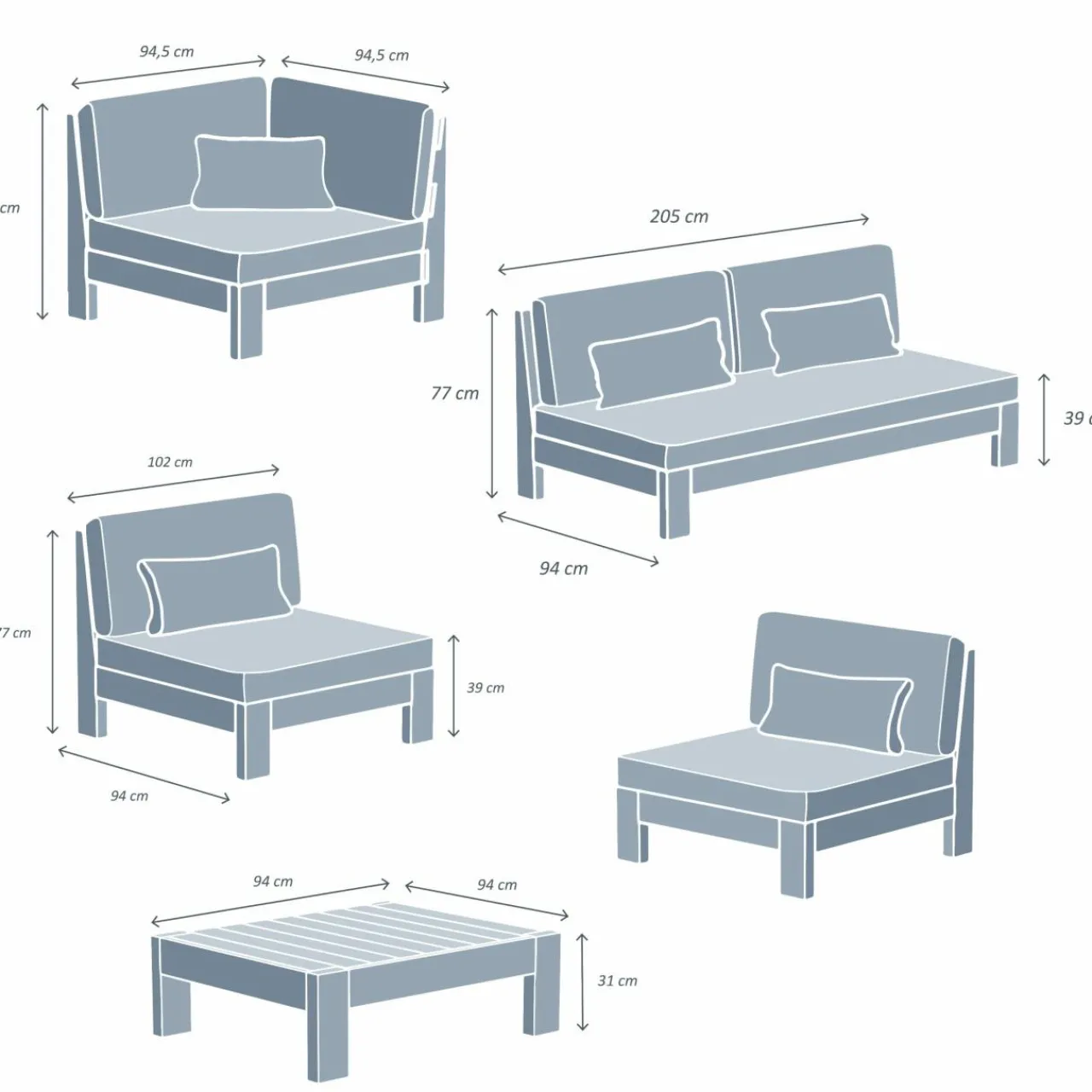 Bornéo, conçu pour accueillir jusqu’à 6 convives, est un salon haut de gamme qui séduit par sa modularité infinie grâce à ses éléments sans accoudoirs. En bois d’acacia massif et équipé de coussins déperlants et déhoussables, il allie confort et praticité. Pensé pour durer, il transforme chaque extérieur en un espace convivial, idéal pour les instants de partage et de détente.
