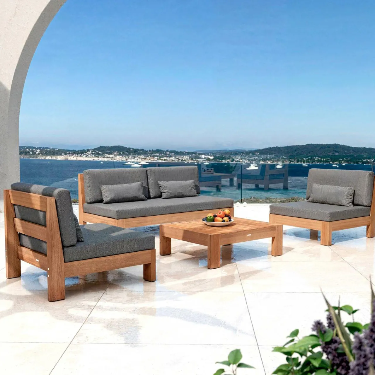 Couleurs : structure bois naturel et coussins gris anthracite.