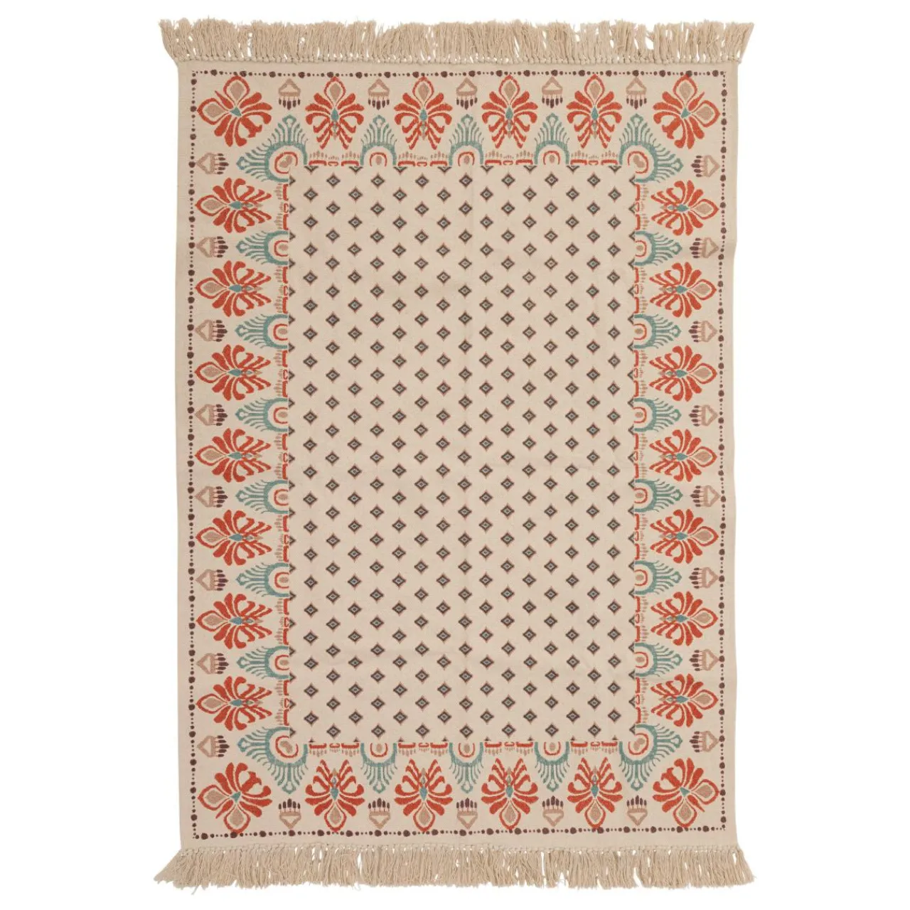 Imprimé : tapis à motif ethnique et à franges.