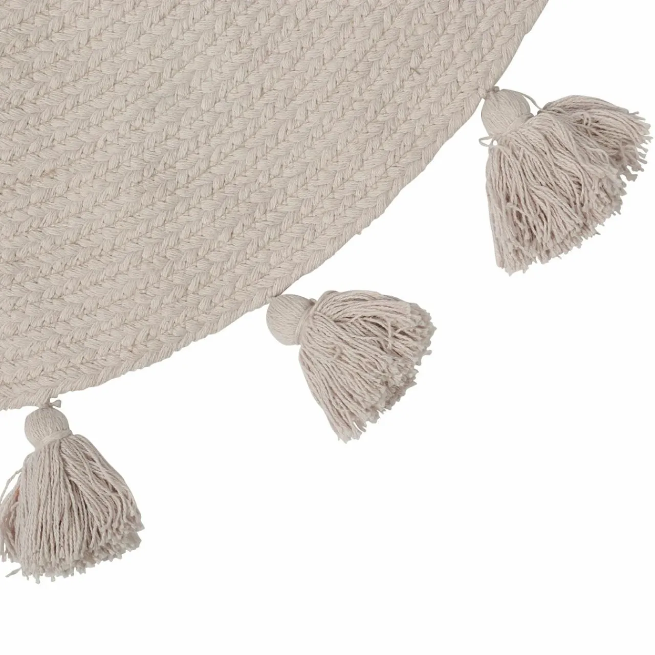 Finition : tapis rond à pompons.