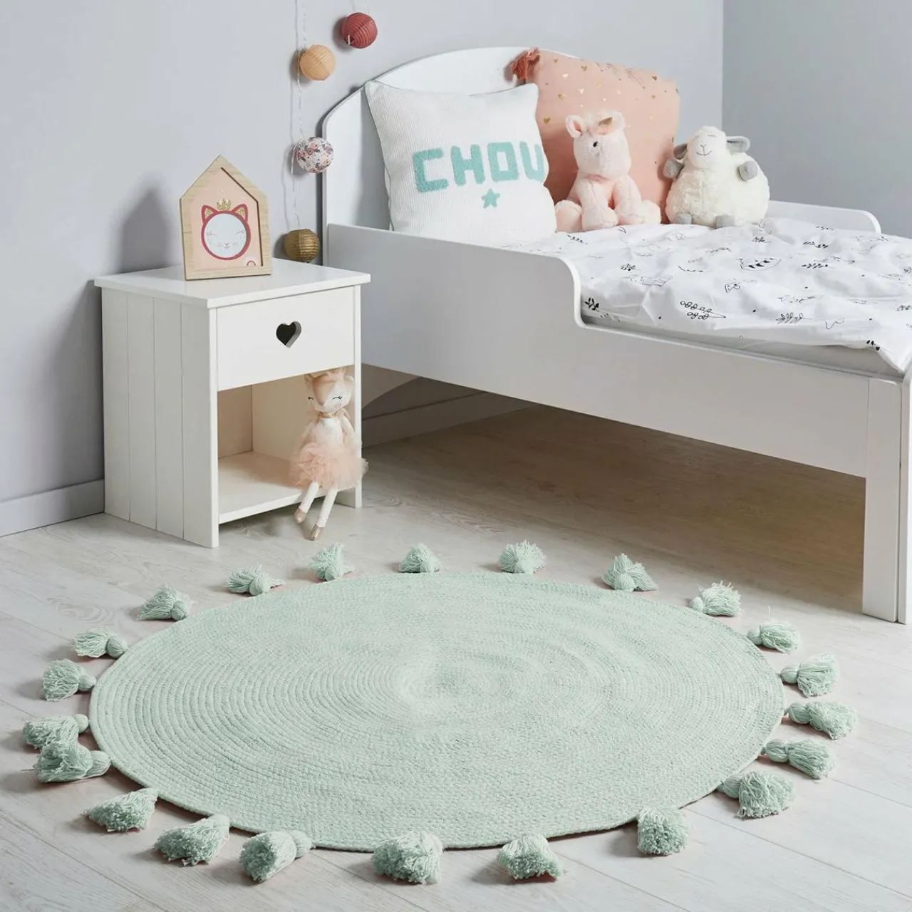 Finition : tapis rond à pompons.