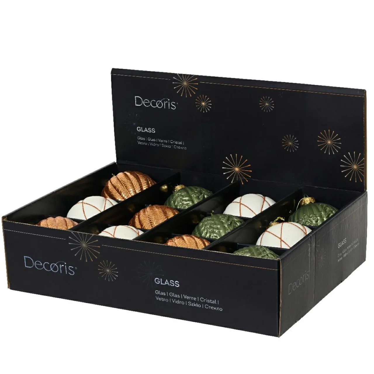 Informations complémentaires : lot de 12 boules de Noël. Finition brillante et mate avec paillettes. Les boules sont munies d’une suspension comprise de couleur or.