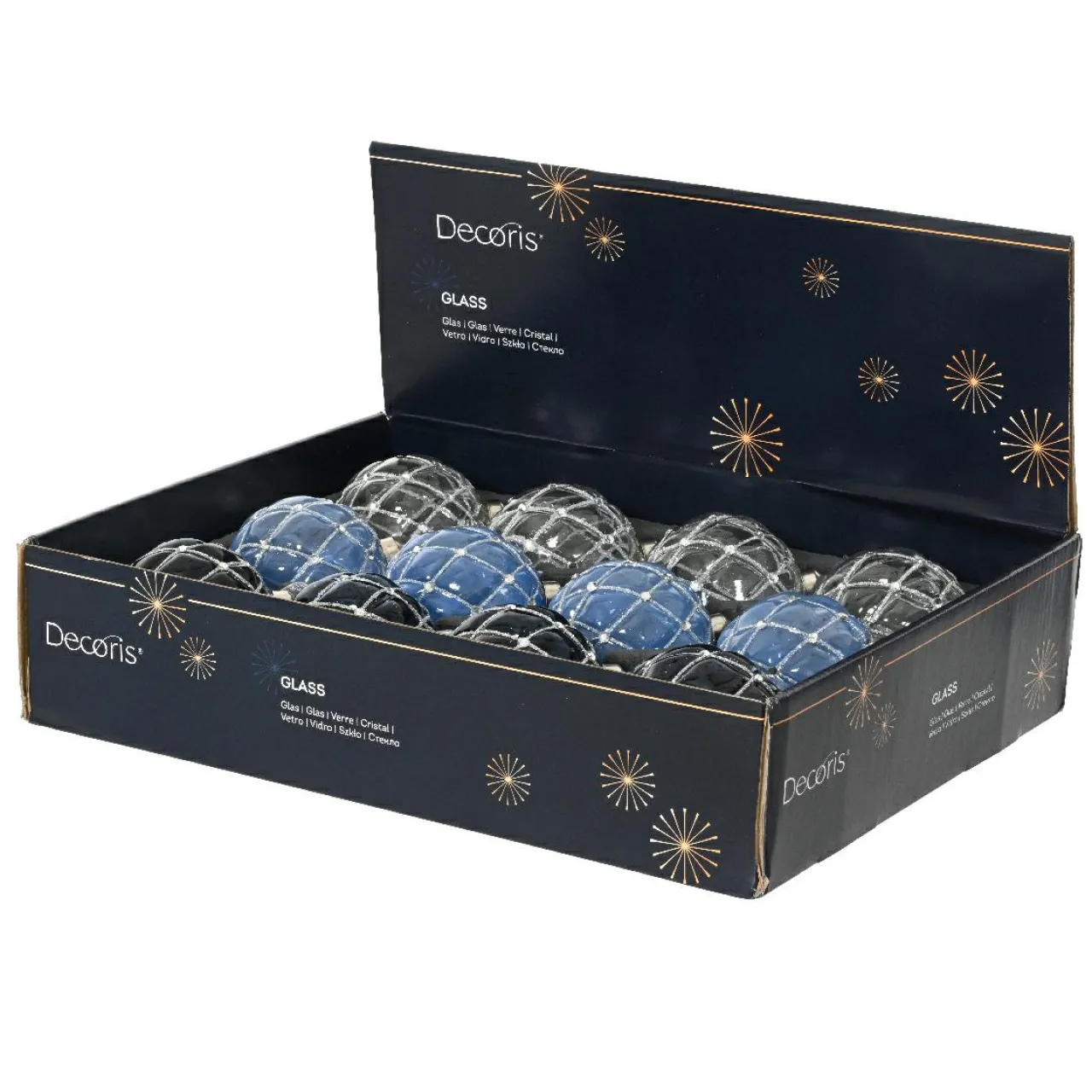 Informations complémentaires : lot de 12 boules de Noël. Quatre boules sont transparentes, quatre sont bleu ciel et quatre sont bleu nuit. Les boules sont munies d’une suspension blanche en ruban d’organza.