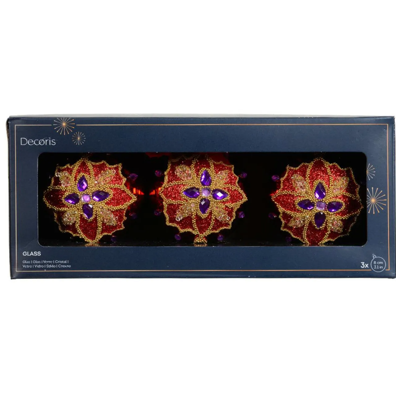 Informations complémentaires : vendu en lot de 3. Les boules sont munies d’une suspension en ruban de velours rouge et d’un couvercle en métal luxueux.
