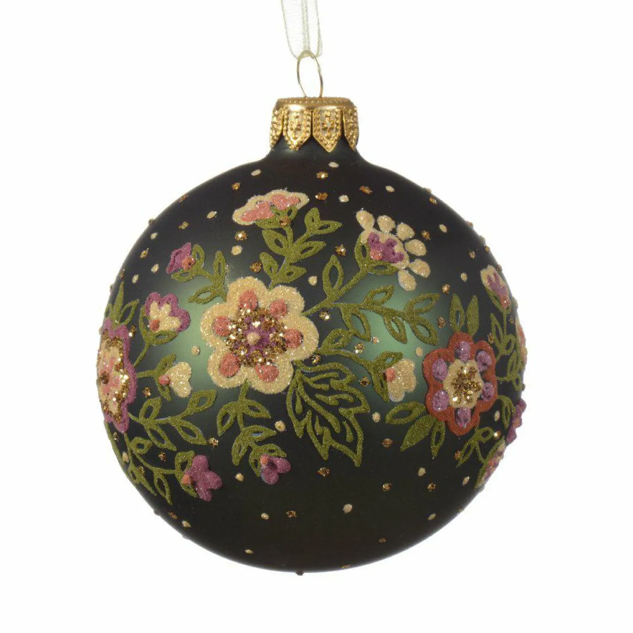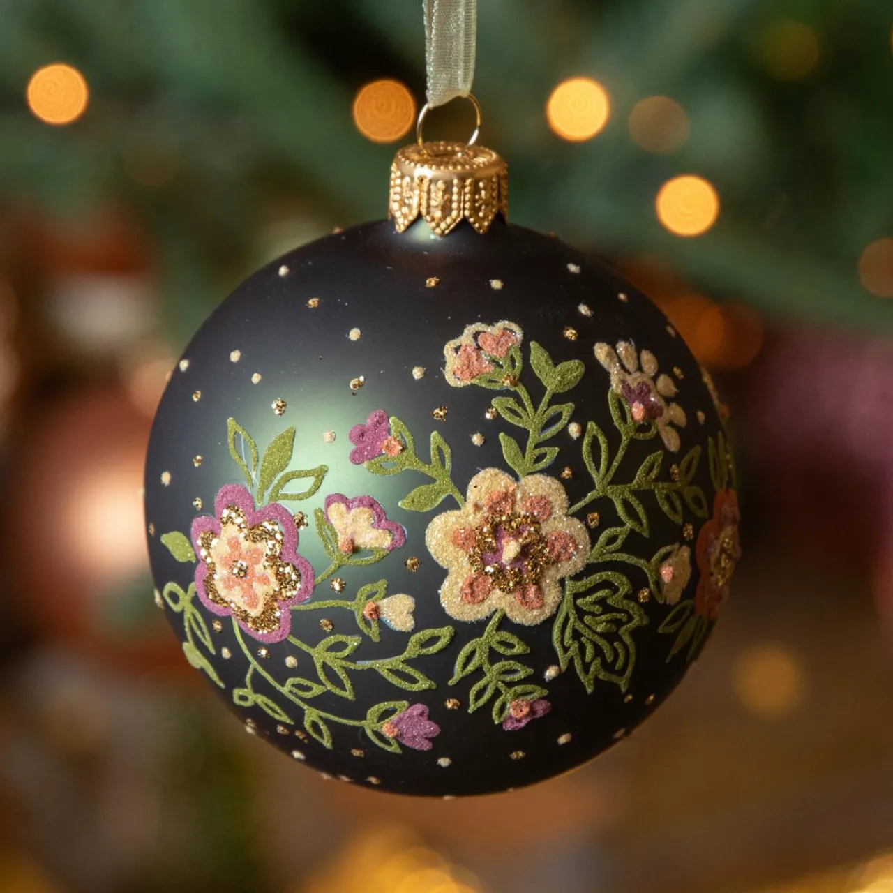 De charmants motifs fleuris sur cette boule de Noël pour un sapin doux.