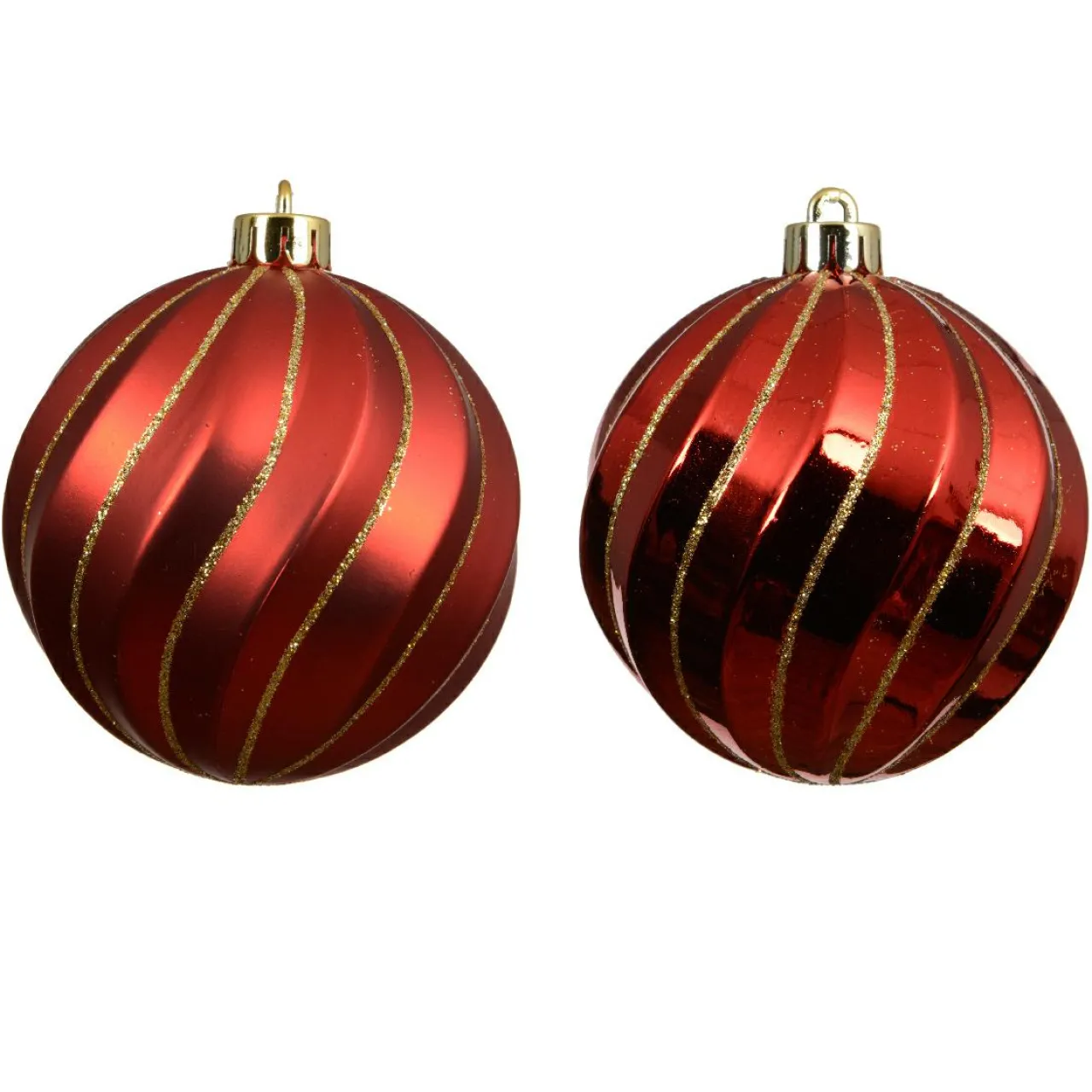 Informations complémentaires : vendu en lot de 6. 3 boules brillantes et 3 boules mates avec rayures ondulées pailletées d’or. Suspension incluse, couleur or.