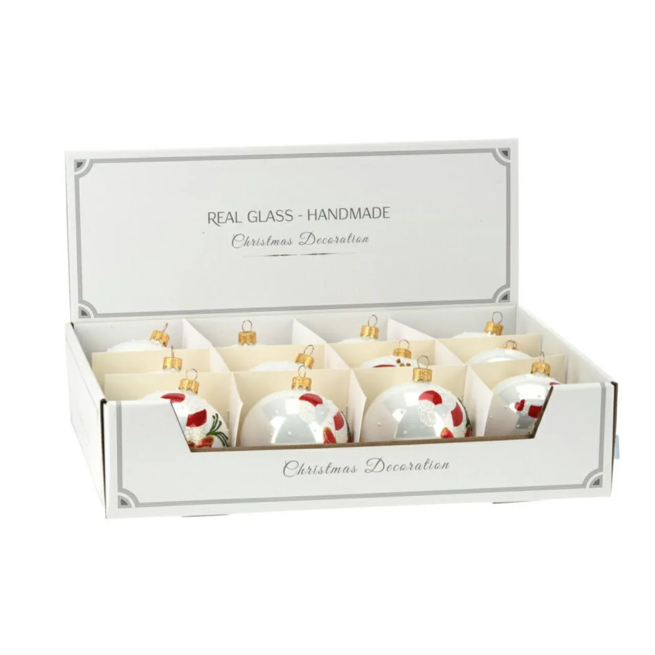 Ces 12 boules de Noël en verre apporteront une touche de tradition à votre décoration de Noël. Avec leurs motifs de sucre d’orge, de chaussette de Noël et de bonhomme de neige sur une base blanche nacrée, elles créent une ambiance festive et chaleureuse.