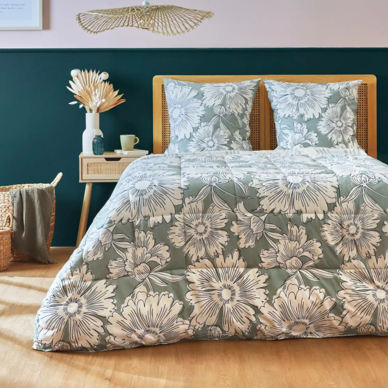 Imprimé : couette à motif floral au recto et rayures au verso.