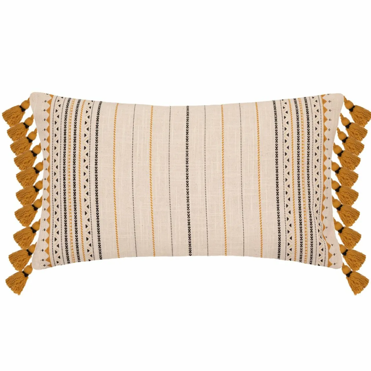 Imprimé : housse de coussin à motif ethnique et à pompons.