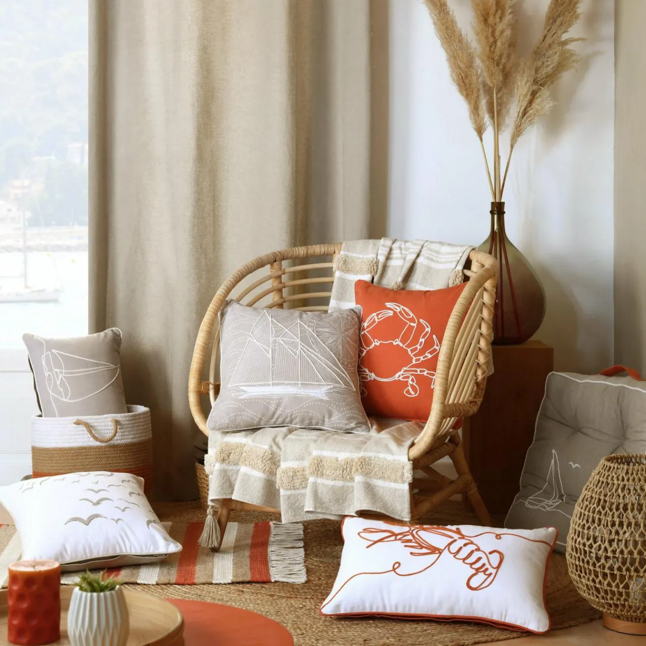 Enivrez-vous d’air marin avec ce coussin en coton imprimé et brodé, esprit bord de mer.