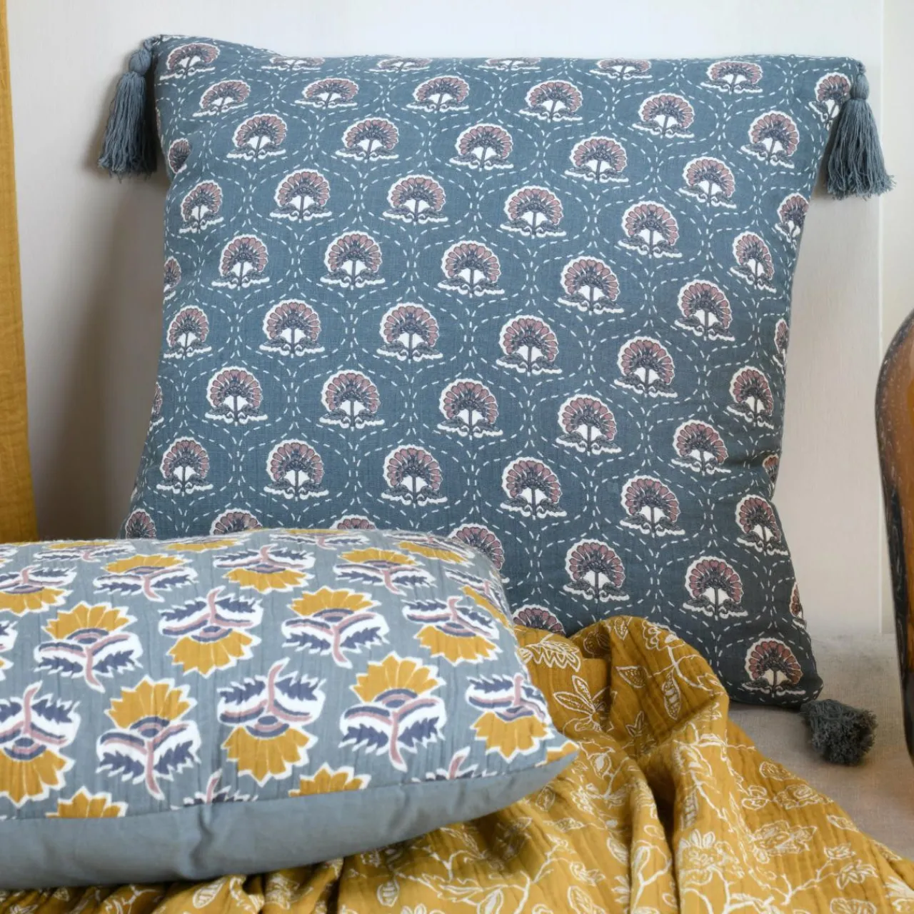 Imprimé : coussin à motif végétal au recto et uni au verso.