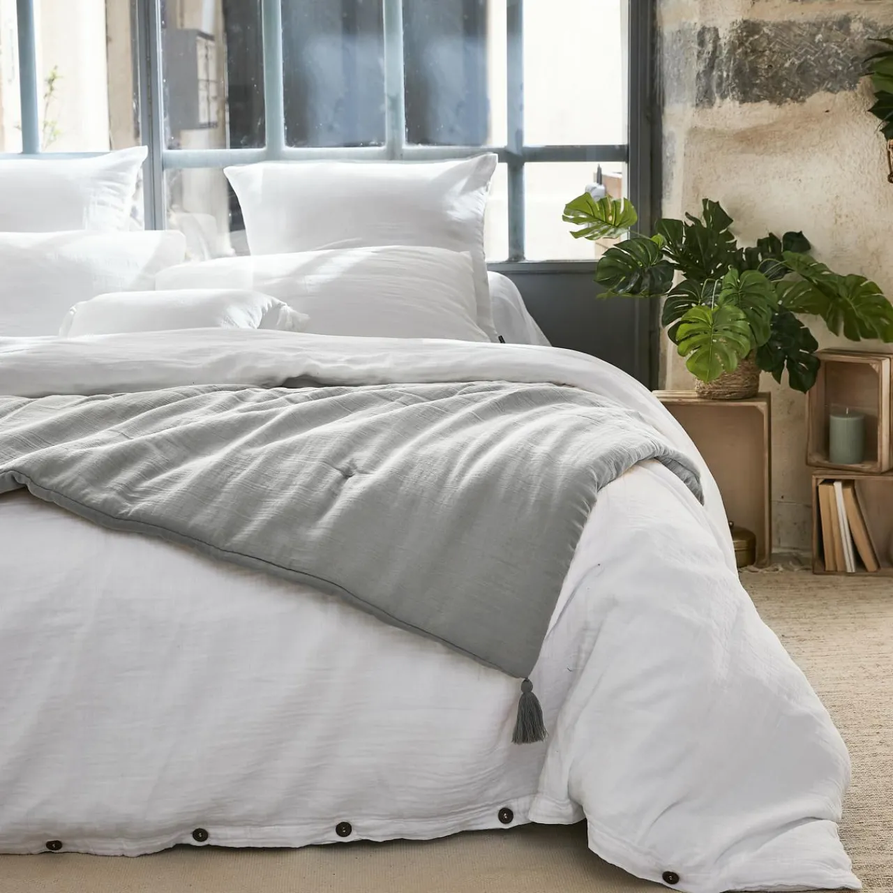 Naturellement gaufré, cet édredon en gaze de coton ne nécessite pas de repassage.