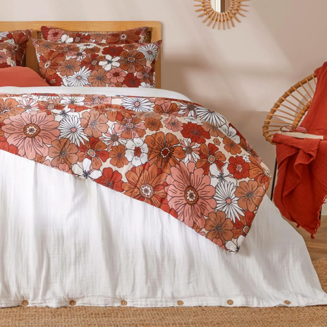 Imprimé : motif floral au recto et uni ficelle au verso.