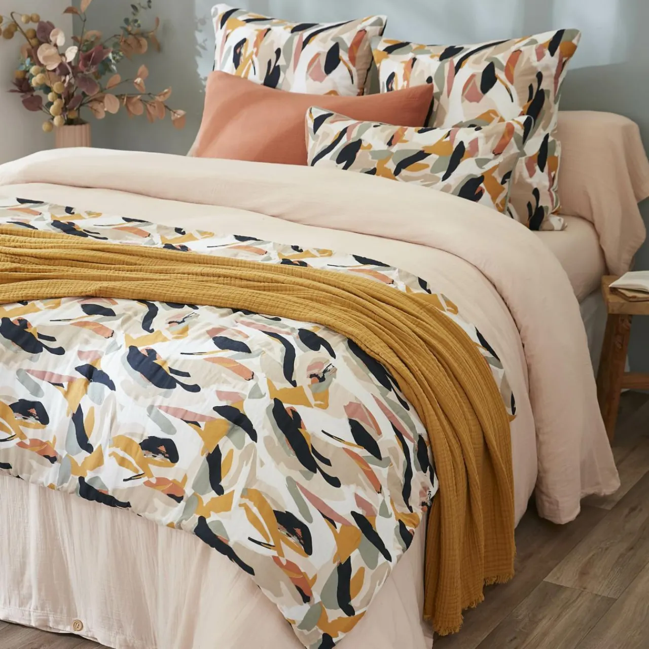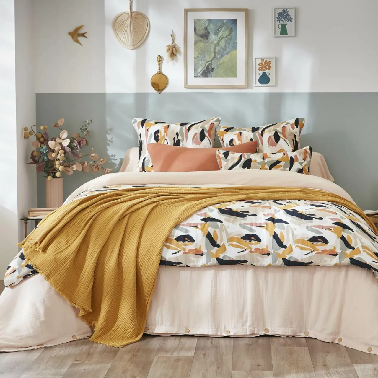 Confectionné en double gaze de coton, il séduit par son motif tacheté au style graphique et coloré, idéal pour apporter une touche moderne et joyeuse à votre décor.