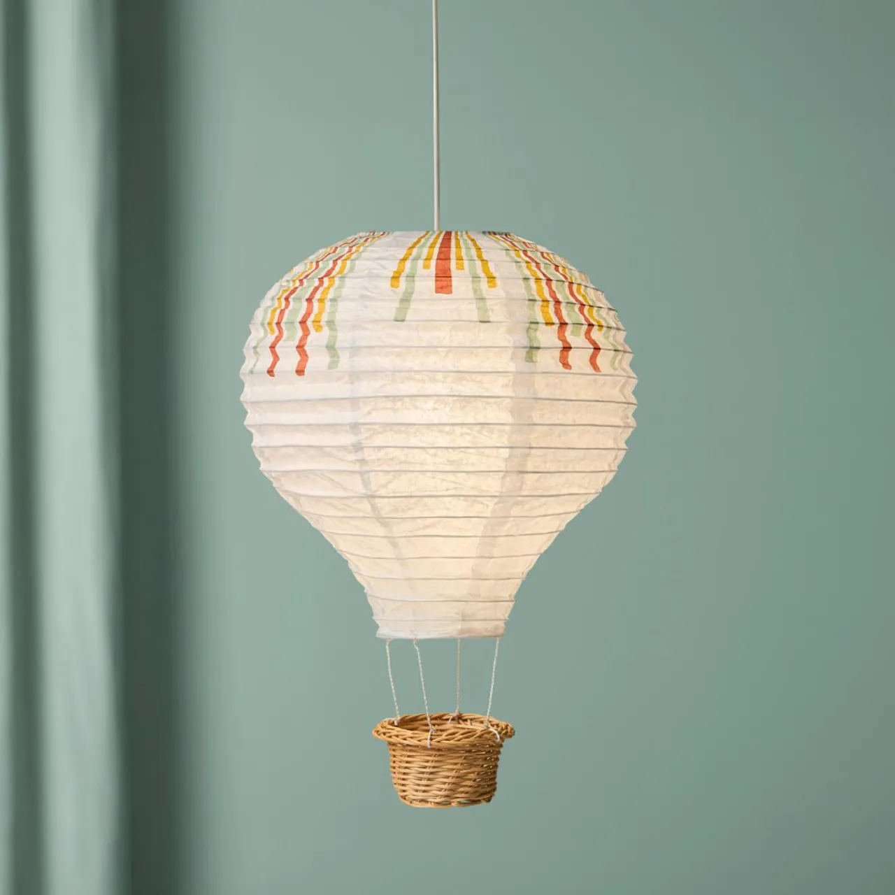Matière : structure en métal, ballon en papier et panier en liane tressée.