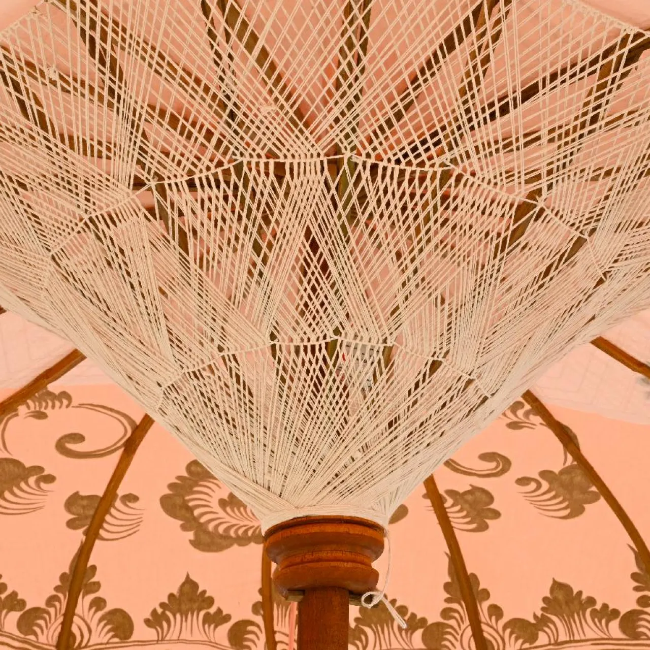 Sa toile est délicatement soulignée de décors métalliques dorés, tandis que son mât en bois, rehaussé de finitions dorées, affirme un style élégant et authentique. Franges et dentelles viennent parfaire l’ensemble, offrant une allure unique qui invite au voyage et sublime chaque coin de terrasse ou de jardin.