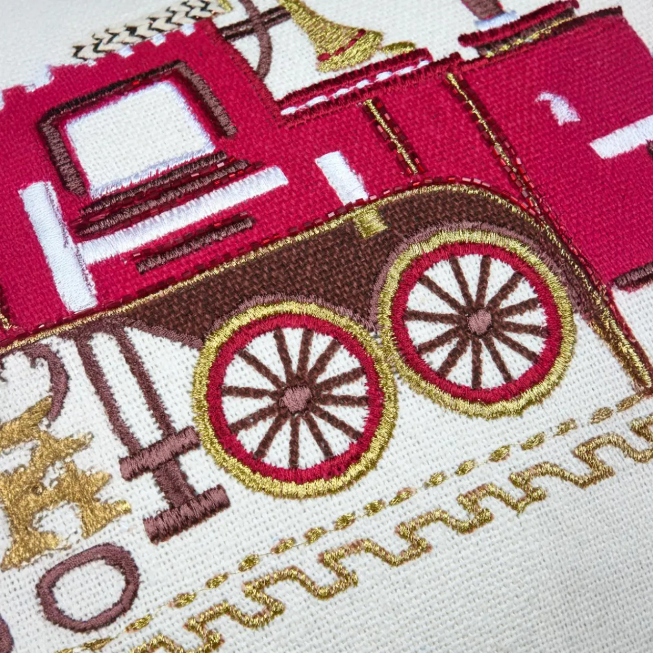 Invitez la magie de Noël dans votre décoration avec ce coussin brodé au look vintage. Avec son motif de train de Noël au recto et son design uni au verso, il apportera une touche festive et chaleureuse à votre intérieur.