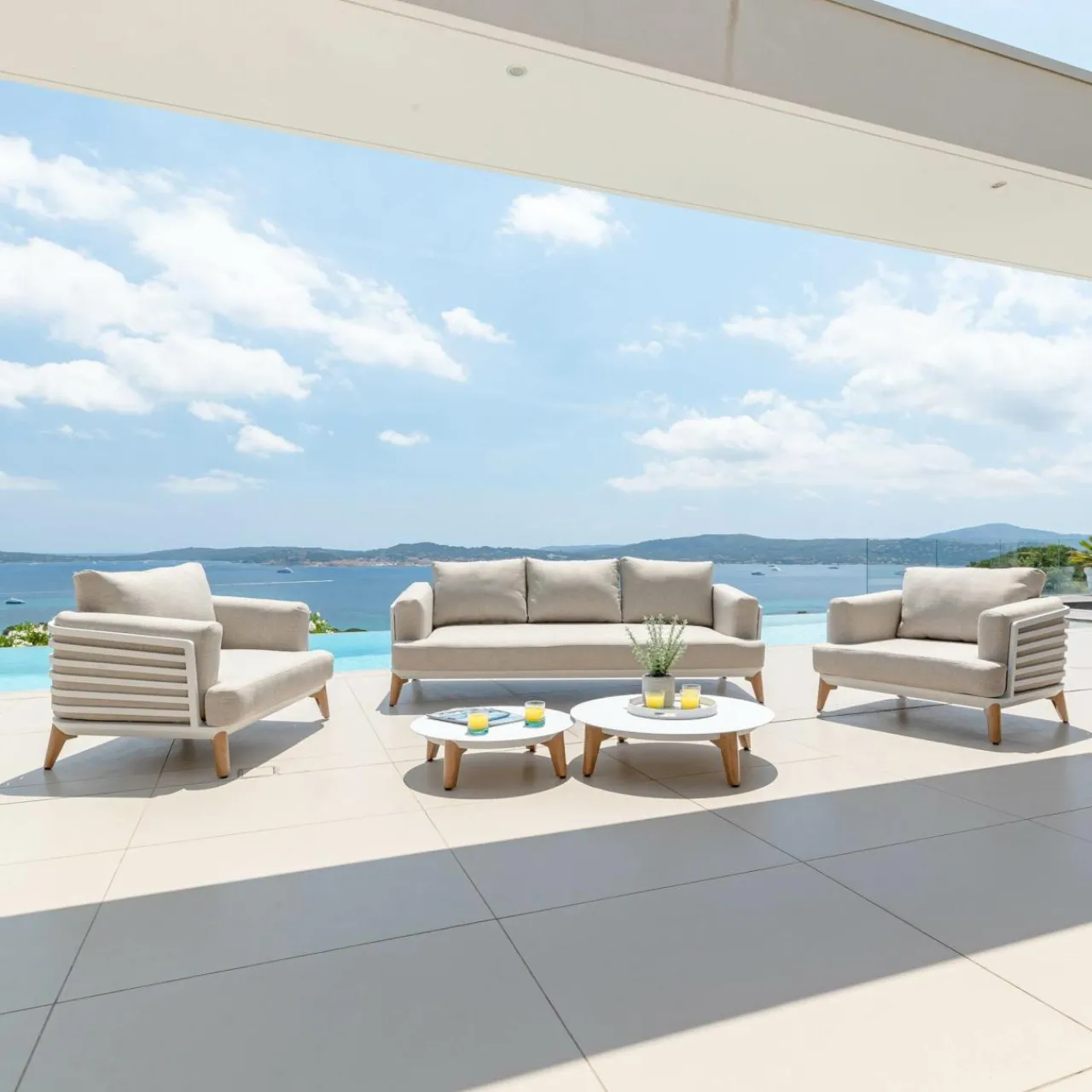 Le salon modulable Monte Carlo est parfait pour accueillir jusqu’à 5 convives avec confort et style. Conçu en aluminium solide, il est durable et résistant, tout en offrant des formes généreuses et un design unique. Ses coussins épais et adaptés à l’extérieur assurent un confort optimal. Avec son dossier ajouré au motif géométrique moderne et ses lignes épurées, il ajoute une touche d’élégance à n’importe quel espace extérieur.