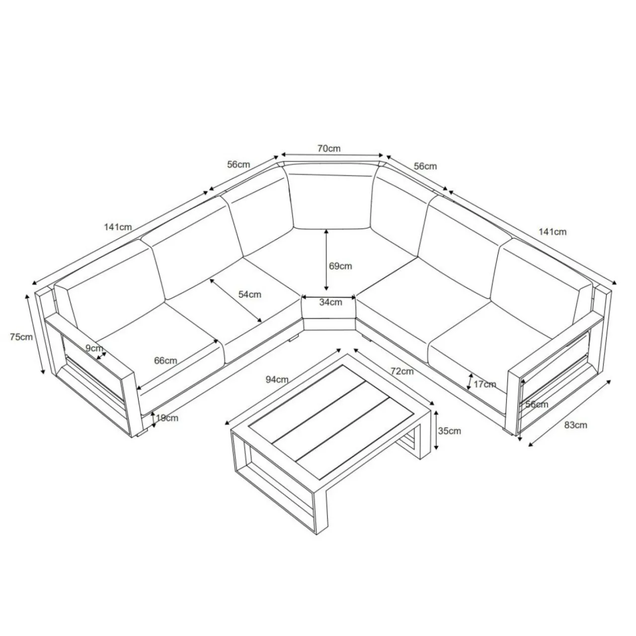– Coussins : déhoussables et déperlants en oléfine 280 gr/m². Densité 25 kg/m3.