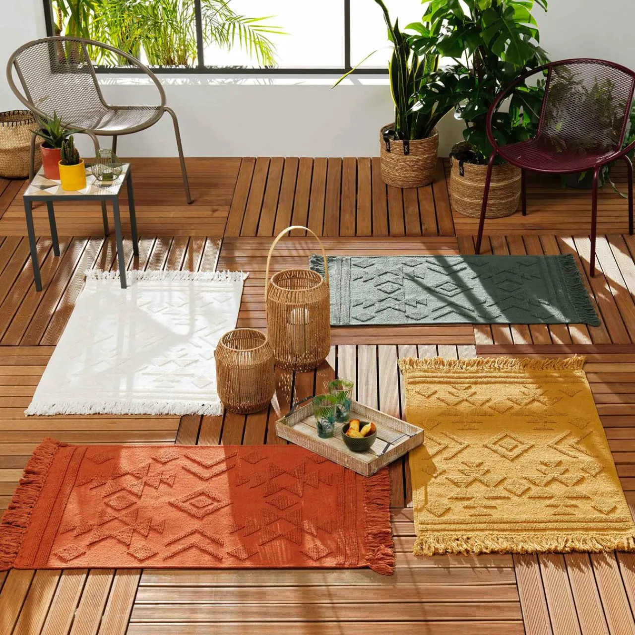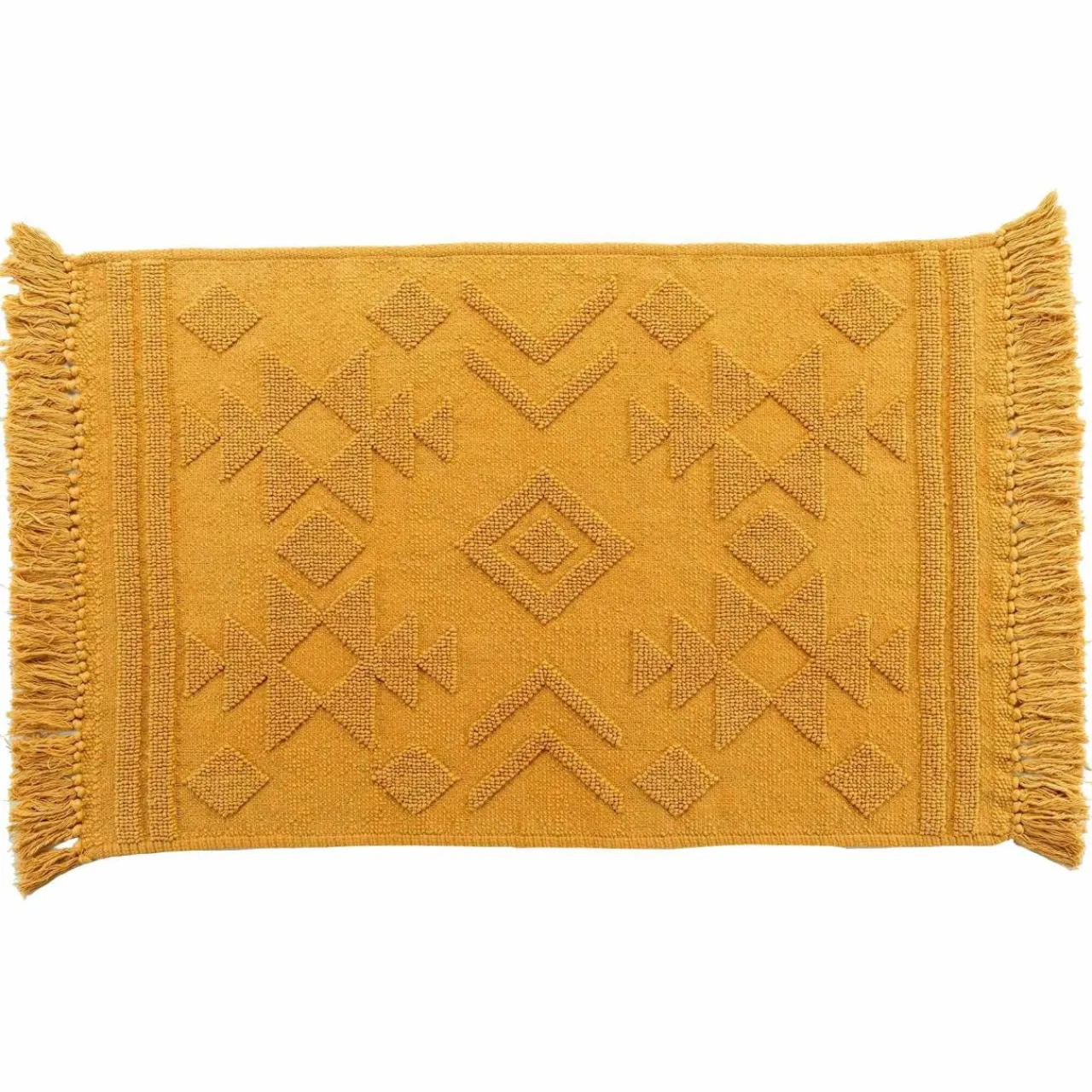 Imprimé : tapis à motif ethnique et à franges.